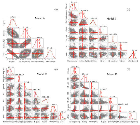 The surface velocity of the viscoelastic model is related to the elastic layer thickness (H), the earthquake recurrence period T, the relaxation time τM, and other parameters [109]. A prior constraint of the unknown parameters is employed according to Table A1.