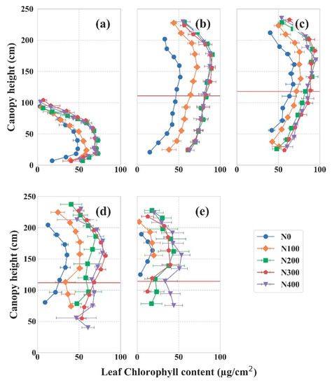 Remote sensing of chlorophyll is a fundamental component of the quantitative remote sensing of crops. Many studies have addressed the vertical distribution of chlorophyll in the canopy because understanding canopy architecture is important for crop growth management and monitoring [5,27]. Solar radiation interception of the canopy structure and nitrogen transference have been identified as the main contributors to vertical heterogeneity of the chlorophyll content in the canopy [5,9,10]. In the present study, vertical distribution of the leaf chlorophyll content (LCC) in the canopy and changes in the correlation between LCC and leaf spectral reflectance were explored. The vertical profile of LCC showed asymmetric distribution, with higher values in the upper–middle layer than in the top or bottom layers [7,8]. In the vegetative stage, the highest values were found in the lower–middle layer (Figure 2). The bottom layers of the canopy were significantly affected by nitrogen supply [14,31]; it appears that a sufficient nitrogen supply can ensure that leaves continue to synthesize chlorophyll and remain vital as the plant matures.