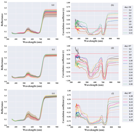 (a,c,e) Spectral reflectance curves for leaves at different positions. The standard deviation interval is shaded in gray. (b,d,f) Correlation coefficient curve for wavebands and the leaf chlorophyll content (LCC) at different leaf positions. The red dashed line indicates p = 0.05. L1–L18 indicate leaf positions from the bottom to the top of the canopy. Chlorophyll-related reflectance in the range of 350 to 900 nm was used.