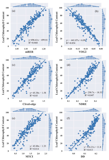 Some VIs that are composed of three or four wavebands, including multiple red-edge and near-infrared bands, also showed good inversion ability for LCC, such as VOG2 (R2 = 0.85), mRER (R2 = 0.87), VOG3 (R2 = 0.85), MTCI (R2 = 0.81), and DD (R2 = 0.81). Previous studies have shown that such VIs have increased robustness and sensitivity compared to dual-band VIs and can reduce the influence of saturation effects [54]. Here, the combination of multiple red-edge bands improved the sensitivity and robustness of the correlation between VIs and LCC.