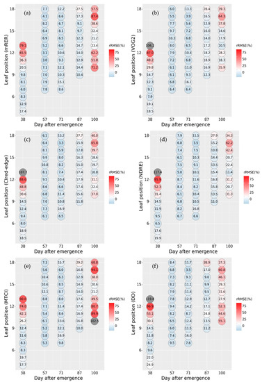 rRMSE (%) of the six LCC–VI models (2019): (a) mRER, (b) VOG2, (c) CIred-edge, (d) NDRE, (e) MTCI, and (f) DD. rRMSE was used to evaluate the consistency of model inversion.