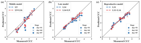 The canopy chlorophyll content (CCC) predicted by the middle model (a), late model (b), and reproductive model (c) compared to measured CCC in 2019. LCC was predicted from mRER, which had the highest accuracy of chlorophyll inversion in this study. The blue dotted line indicates predicted CCC from LCC of one leaf position, and the red line indicates predicted CCC from LCC of two leaf positions. The 2019 dataset included three growth stages: the sixteen-leaf stage (day 51, V16), silking stage (day 64, R1), and filling stage (day 87, R3).
