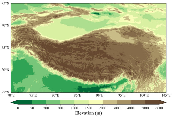 The Tibetan Plateau, often referred to as the “roof of the world”, is the largest plateau in China and the highest in the world. It is located south of the Himalayas, north of the Kunlun and Altun Mountains, west of the Pamir Plateau, east of the Qinling Mountains, and connects with the Loess Plateau. Its length is ~2800 km, its width is ~300–1500 km, and the total area is ~2.5 million km2. According to the terrain, it can be divided into six parts: Qiangtang Plateau, Southern Tibet Valley, Qaidam Basin, Qilian Mountains, Qinghai Plateau, and Sichuan–Tibet Plateau Valley. It is an important task to study and monitor the meteorology of the Tibetan Plateau. In this paper, the Tibetan Plateau and the nearby highlands above 500 m were selected as the study area, in order to maintain topographic coherence; scattered regions located north of 35°N that were lower than 500 m were also included as the study area. The topographic distribution of the study area is given in Figure 1, and the elevation data were 2-Minute Gridded Global Relief Data (ETOPO2) v2 from the NCEI (National Centers for Environmental Information).