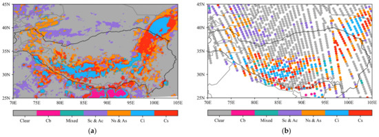 The Cloud-Aerosol Lidar and Infrared Pathfinder Satellite Observation (CALIPSO) is an Earth-observing satellite project initiated and executed by NASA’s Langley Research Center and the National Space Research Center of France in 2006. It orbits the Earth at 705 km altitude, 1.55°, and 96 min orbital parameters, respectively, for 16 days to retrieve data on a three-dimensional distribution of the cloud and aerosol layers around the globe [42]. The CALIOP lidar is a key instrument of the CALIPSO satellite as it provides polarization backscattering vertical profile data for clouds and aerosols between south and north latitude 82° on a 532 nm channel and attenuation scattering vertical profile data on a 1064 nm channel [43,44]. CALIOP can be used to accurately reconstruct the vertical distribution of clouds and aerosols as well as to quantify their size, irregularity, and type of aerosol particles, by considering vertically resolved backscattering coefficients with high resolution. This study used the CALIPSO LIDAR Level 2 Version 4.2, 1 km Cloud Layer and matched it to AMSU-A using the same space–time matching method as the VISSR-II Cloud Classification Product.