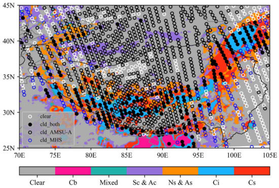 Because of the differences in the temporal and spatial resolution of the observed BT of AMSU-A and cloud classification products of VISSR-II, it is necessary to match the two in time and space. Cloud types, unlike air pressure and temperature, are not continuous, and there is, frequently, more than one type of cloud in the same AMSU-A FOV. As a result, the cloud type that occurs the most in a scanned AMSU-A FOV was selected as the representative cloud type for this FOV, and the diameter of the FOV was chosen as 25 km based on the size of the scanned AMSU-A FOV. In terms of time, the closest time between the two observations was selected, and the maximum time error was within 3 h to ensure that the cloud system did not change dramatically within the time error. From Figure 2a,b, it can be seen that the matching method only ignored some broken clouds in the clear-sky area, and the main cloud systems were well matched.