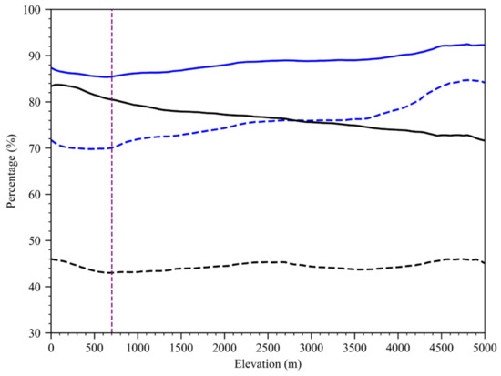 Detection rate of cloudy data (solid curves) and rejection rate of clear-sky data (dashed curves) for the new thresholds (black curves) and old thresholds (blue curves) above different topographic heights in East Asia from 1 to 31 August 2019.