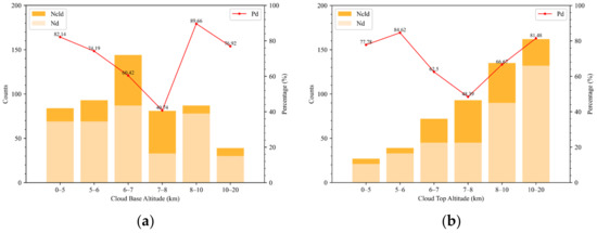 The data count of cloudy data in the CALIPSO product (orange bar), and that detected by the cloud index (bisque bar), red curves are for the detection rate of cloudy data varying with (a) cloud base altitudes and (b) cloud top altitudes in August 2019.