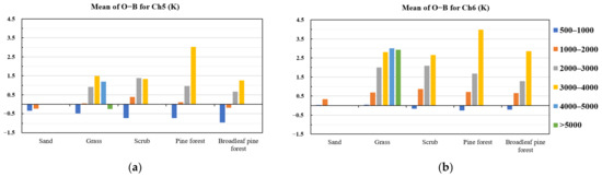 From Figure 9a,b, it can be seen that the simulated BT deviations of both channels were positive at all heights except 500–1000 m. In channel 5, the simulated BT deviation was within 1.5 K for all vegetation types except pine forest distributed at 3000–4000 m. The deviation of the simulated BT in channel 6 was relatively larger, and the deviation of the simulated BT in pine forest distributed at 3000–4000 m was the largest, exceeding 4.0 K. The deviation of the simulated BT in the remaining vegetation types was within 3.0 K. The deviation of the simulated BT in the height range below 2000 m was within 1.0 K. The deviation exhibited an increasing trend with increasing terrain height, especially when the terrain height was higher than 2000 m. In the GSI (Gridpoint Statistical Interpolation) assimilation system, the terrain height of 2000 m was also taken as the dividing line, and different deviations and error coefficients were given to the observations above this height, which is consistent with the findings of this paper [46].