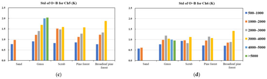 Histograms of (a,b) the average O−B and (c,d) standard deviation of clear-sky observations for AMSU-A (a,c) channels 5 and (b,d) channel 6 for five vegetation types at different topographic heights over the Tibetan Plateau region on 1–31 August 2019.