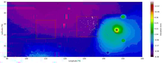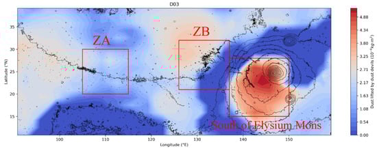 Before the landing of Zhurong, two target landing locations in southern Utopia Planitia were selected (private communication with the Chinese Academy of Space Technology), namely location A (center latitude: 25° N, longitude: 110° E), and location B (center latitude: 26.67° N, longitude: 131.67° E). Their locations are shown in Figure 1 (red stars). With locations A and B as the centers, the red boxes are set as our study regions (span ~10° in the latitude and longitude, Figure 1), and named as zone A (ZA, latitudes: 20–30° N, longitudes: 105–115° E) and zone B (ZB, latitudes: 21–32° N, longitudes: 126–137° E).
