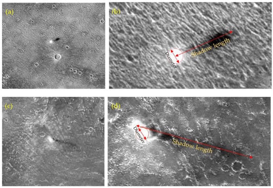 Examples of measuring the diameter and shadow length of ADDs. (a,b) are from CTX image p15_006934_2076_xn_27n224w (Table 1). (c,d) are from CTX image p19_008503_2058_xn_25n227w.
