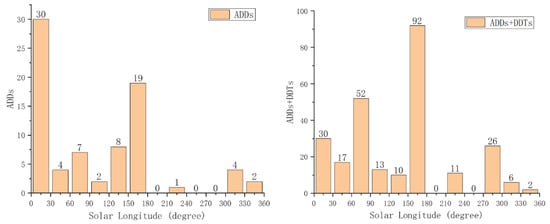 As can be seen from Figure 3 (left), the number of ADDs shows a prominent two-peak pattern in the temporal variation, with peaks in the local early spring (Ls: 0–30°) and late summer (Ls: 150–180°). This two-peak pattern of ADDs occurrence has also been found in other regions in some previous studies, such as the Argyre Planitia [], and the Amazonis Planitia []. Combining with the results from the previous research of [], based on dust devil tracks (DDTs) in the same study area (Figure 3, right), it can be seen that the sum of ADDs and DDTs still show a two-peak pattern, as before. However, the first peak came a little bit late.