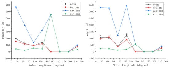 In addition to the occurrence of DDs, we also surveyed their sizes. Observed ADDs by orbiters are usually tens of meters to hundreds of meters in diameter, and hundreds of meters to thousands of meters in height, with a narrow base and broader top. A typical ADD is usually composed of a small bright cloud with long tapered shadows []. Although some small terrains may also show this feature, it can be ruled out by the images in the same location at a different time.