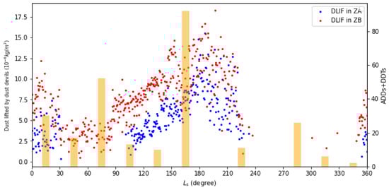 Time series of total daily dust lifting by dust devils (DLIF) averaged in ZA (blue dots) and ZB (red dots). Orange bars are the observed number of DDs as shown in Figure 3.