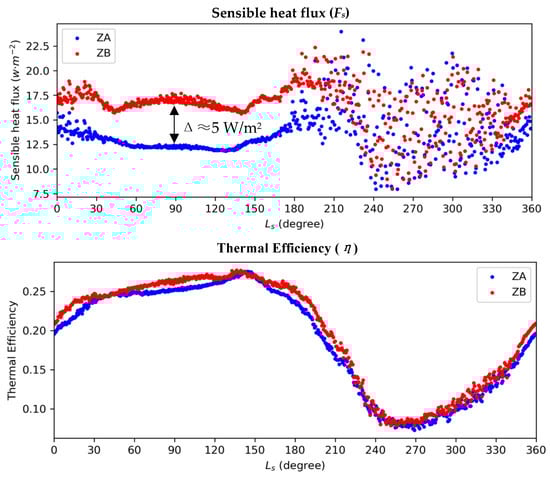 The predicted DDs from MarsWRF are reflected by DLIF. The time series of DLIF in ZB (Figure 5) shows that the temporal pattern of predicted DDs is generally consistent with observations. Obviously, the DLIF in ZB is higher than that in ZA in the first half of the year. In addition, in both ZA and ZB, there are two peaks of DLIF during their local early spring and late summer, which are in good agreement with the observations. After entering the dust season (the second half of the year), the generation of dust devils is very rare, which is also consistent with our observations and similar to those in previous studies []. To further understand why there are more DLIFs in ZB and the two-peak structure in temporal distribution, we analyzed the corresponding temporal variation in sensible heat flux and thermal efficiency, based on Equation (1).