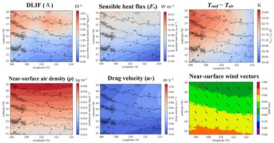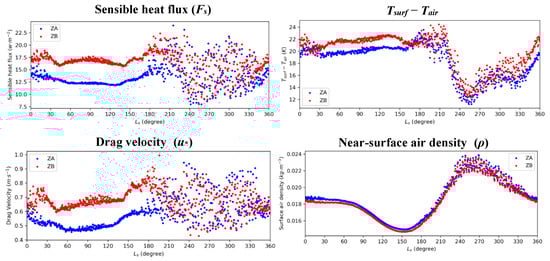 According to Equation (1), we plotted the spatial distribution of sensible heat flux (Figure 9, second column) and thermal efficiency (Figure 9, third column) in their local summer (Ls: 150–180°). In ZA, the predicted DDs are mainly distributed in the north and this distribution is mainly determined by the sensible heat flux. The thermal efficiency in ZA has an opposite trend in the south–north direction. As mentioned above, the predicted DDs in ZB are mainly distributed in the northwest. In addition, the relatively large DLIF in the northwest of ZB is dominated by the sensible heat flux. The thermal efficiency may also play a positive role in the greater DLIF in the northwest of ZB, although the effect is much lower than that of the sensible heat flux. Notice that the DLIF in the southeast of ZB is nearly zero, while the sensible heat flux and thermal efficiency in the southeast are relatively large. This could be caused by the conditions for the occurrence of DD in the DD parameterization (discussed in Section 3.1), which will be further explained later. Overall, from the model results, we can see that the spatial distribution of DLIF both in ZA and ZB is dominated by sensible heat flux. To further understand the possible environmental conditions that contribute to the spatial distribution of sensible heat flux, we analyzed their contributors in ZA (Figure 10) and ZB (Figure 11), according to Equation (4).