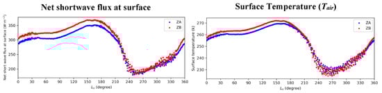 Overall, in the first half of the year, the sensible heat flux and thermal efficiency in ZB (Figure 6) are always higher than those in ZA, and the difference in sensible heat flux between ZA and ZB (~5 W m−2) is generally larger than that of the thermal efficiency. Based on the DD theory of Rennó et al. [], it can be inferred that the difference in DLIF between ZA and ZB is mainly determined by sensible heat flux, which, in turn, is mainly related to the surface-to-air temperature difference (~2 K, Figure 7). The drag velocity plays a minor role in the difference (~0.2 m s−1). Besides, the mean albedo in ZA is about 0.229, while the mean albedo in ZB is around 0.205. This difference in albedo is also reflected in the net short-wave flux at the surface (short-wave flux at surface minus the reflected short-wave flux), which in ZB, is always stronger than ZA in their local spring and summer (Figure 8). By intuition, ZA and ZB are at similar latitudes and so should have similar solar radiation at the surface. The above results suggest that more DDs in ZB are mainly due to the relatively low albedo there.