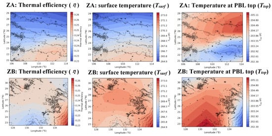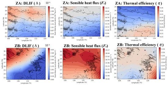 Although DLIF is mainly determined by the sensible heat flux in both ZA and ZB, it is still worth analyzing the thermal efficiency. According to Equations (2) and (3), thermal efficiency is proportional to the temperature difference between the surface and the top of the convective vortex. Considering the spatial distribution of thermal efficiency (Figure 14), we can see that its pattern is dominated by the surface temperature in both ZA and ZB, and the distribution of surface temperature has been discussed before. Therefore, the distribution of thermal efficiency in ZA is mainly related to solar radiation, while it is mainly related to the distribution of albedo in ZB.