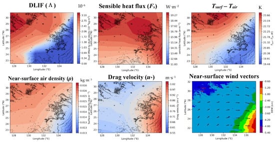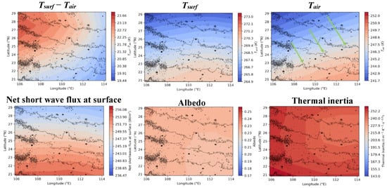 The predicted sensible heat flux in ZA (Figure 10) decreases from northwest to southeast, and so does the surface-to-air temperature difference (Tsurf − Tair). The variation in near-surface air density (~0.001 kg m−3) and drag velocity (~0.2 m s−1) shows a similar trend but the variation is very small. In addition, the wind direction basically corresponds to the Hadley circulation and thermal tide during their local summer. This indicates that the spatial distribution of sensible heat flux is mainly determined by the surface-to-air temperature difference. To better understand the surface-to-air temperature difference, the surface temperature, near-surface air temperature, net short-wave flux, and surface properties are further analyzed (Figure 12). The surface temperature decreases with increasing latitudes, and so does the net short-wave flux at the surface. On the other hand, the variation in the spatial distribution of albedo and thermal inertia is very small and, thus, shows little effect on the spatial distribution of surface temperature. The near-surface air temperature increases from northwest to southeast, which may be caused by thermal advection. These results show that the distribution of surface-to-air temperature difference is mainly determined by the solar radiation and thermal advection, which, in turn, determines the distribution of sensible heat flux and so the DLIF.