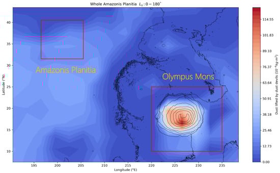 From the simulation results, it is worth noting that there are more predicted DDs in the south of the Elysium Mons compared with that in ZA and ZB (Figure 15). However, from 518 CTX images (~8 MY), there are only 12 ADDs found in the south of Elysium Mons. The list of CTXs with ADDs in the south of Elysium Mons is shown in Table 2. In a similar geographical situation, there are only two DDs found in the south of the Olympus Mons, and a large number of DDs (9827) were found in the Amazonis Planitia from the global survey of DDs []. However, in our numerical simulations, DLIF in the south of Olympus is also greater than that in the Amazonis Planitia (Figure 16). Nevertheless, our simulations did very well in the time series of DDs in the Amazonis Planitia (Figure 17). The above discrepancy in DDs suggests that the present configuration of MarsWRF is likely not good enough to predict DDs in mountainous areas. There are two possible reasons for the discrepancy. One is the use of the unlimited dust source in our model, while in reality, there may be little dust on the hillside (most of which is blown away by the wind). The other one is that the parameterization of dust-lifting processes is not good enough for mountainous areas. Improving the simulation of DDs in mountainous areas is one important task of our future work.