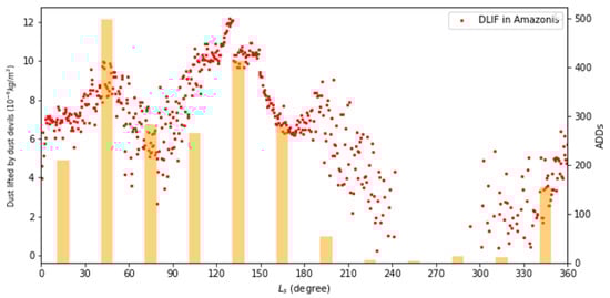 Time series of dust devils in Amazonis Planitia (Adapted from Ref. []) (orange bar) and model-predicted dust devils averaged in the same study area (red dots).