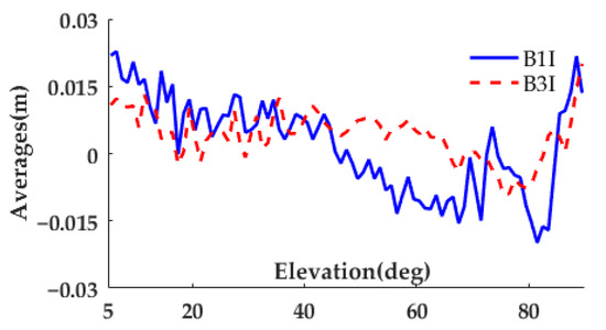 Averages of multipath error at B1I and B3I in each elevation bin.