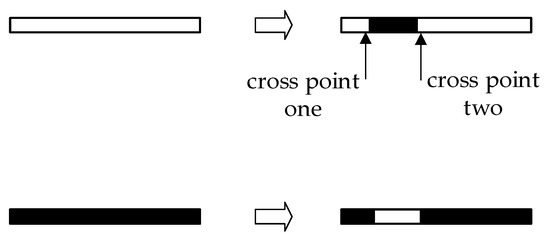 In terms of chromosome crossover, the principle of the two-point crossover strategy is illustrated as follows in Figure 5. The location of cross points is determined randomly.