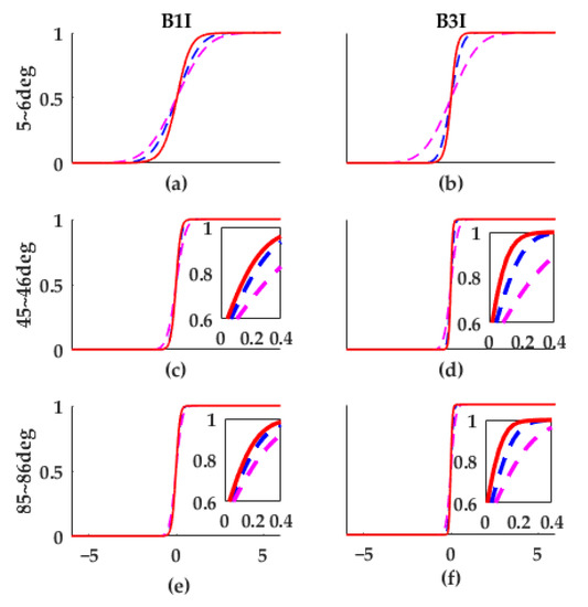 CDF of constructed models and multipath error. The sub-figures (a,c,e) are results of B1I and (b,d,f) are results of B3I, respectively. The red lines are CDF of actual multipath error, the dashed blue lines are that of constructed models based on two inflation factors, and the dashed magenta lines are that of constructed models based on single inflation factor.