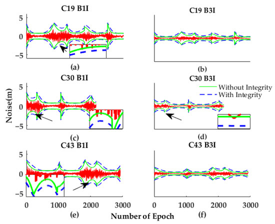 Figure 8 plots a three-day time series of multipath error and the corresponding 3.29-Sigma series of our constructed models. The value 3.29 is the standard Gaussian quantile corresponding to 99.9%. To verify the effectiveness of the model for various satellites, three satellites from different platforms (http://en.beidou.gov.cn/SYSTEMS/Officialdocument/, accessed on 20 April 2022) were selected. The period without observation was removed in the figure. Since the B3I signal has a larger code rate [28], it suffers obviously less from multipath effect [29] than B1I.