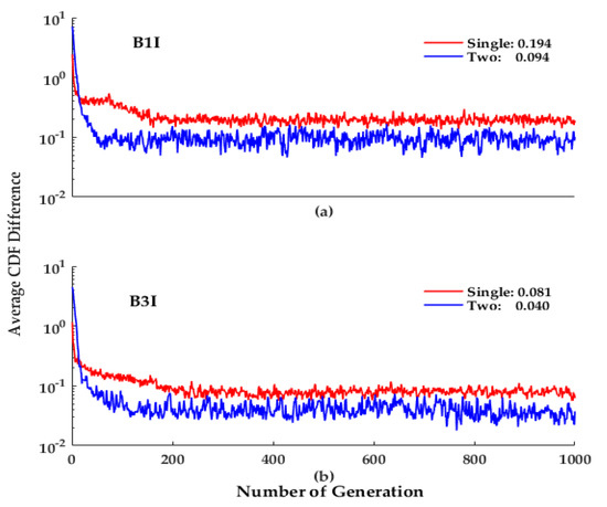 Average CDF difference comparison. The sub-figures (a,b) are results of B1I and B3I respectively.