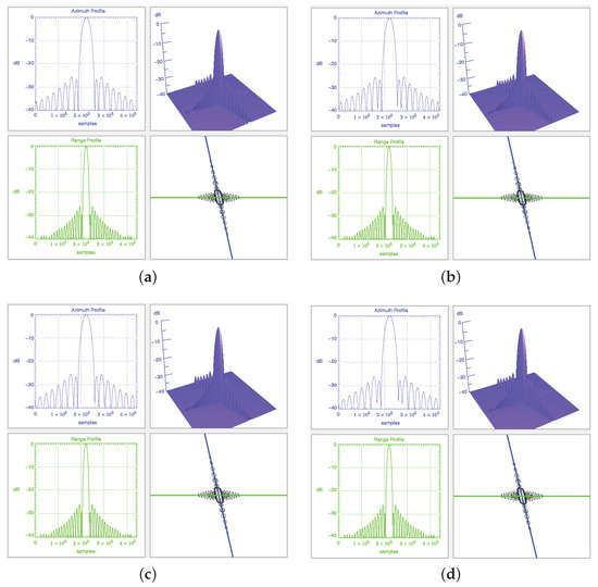 Partial imaging results of point targets at different positions in the scene. (a) Target located at the scene center. (b) Target at 0 m in azimuth and 4500 m in range. (c) Target at 0 m in azimuth and −4500 m in range. (d) Target at −4500 m in azimuth and −4500 m in range.