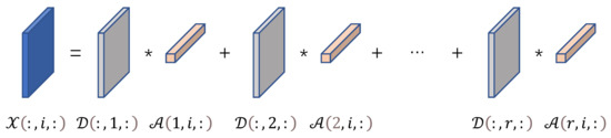 where indicates a third-order tensor which is stacked by n images of size . represents a dictionary which also is a third-order tensor and per lateral slice of the dictionary indicates an atom. So, r expresses the number of atoms. represents the tensor sparse coefficients. is a sparse regularization parameter. According to the algebraic form of tensor-tensor product, each lateral slice of can be linearly combined by tensor dictionary and tensor coefficient. Here, we present a linear combination representation of each lateral slice below as shown in Figure 1.