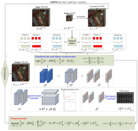 Given the tensor linear combination sparse representation model based on t-prodcut, we proposed a super-resolution method based on this model. To take full advantage of the nonlocal self-similarity of hyperspectral images, we first performed nonlocal clustering on the up-sampled LR-HSI and HR-MSI, and transformed the problem into the reconstruction of each cluster of HR-HSI. Then per nonlocal cluster tensor was decomposed into two sub tensors under the tensor t-prodcut framework, and the potential properties of each sub tensor were explored. Specifically, the tensor dictionary was constrained by the prior knowledge of spectral smoothing (spectrum continuity) of HSIs. In addition, the norm was utilized to well characterize the tubal-row sparsity of tensor coefficients. Finally, the ADMM algorithm was employed to iteratively solve our model. The flowchart of the proposed method is shown in Figure 2.