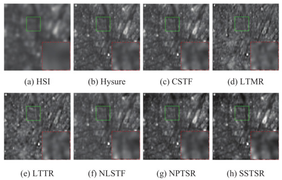 The real data set was captured and formed from the scenes over Paris. Among them, the multi-spectral data was provided by The ALI Instrument, and the hyperspectral data was captured and formed by Hyperion. The size of HSI was , the size of MSI was . For the estimation of spectral response function and blurring kernel, we employed the algorithm proposed in [17] according to the input data. Similarly, for CSTF, we used a separable blurring kernel to guarantee the maximum fair comparison. Since there was no ground truth maps, we did not list the quantitative results. In Figure 10, we illustrated the images of band 90 of the competing algorithms for visual comparison, and it was clear that the results of the proposed SSTSR super-resolution method contained more fine details, as shown in the red rectangle.