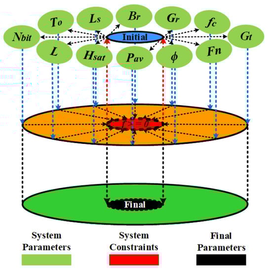- if the constraint is satisfied, the final system parameters of spaceborne SAR are obtained, which are denoted by the black ellipse, and the SAR system design process is terminated;