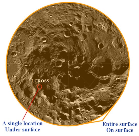 - Colaprete, A.; Schultz, P.; Heldmann, J.; Wooden, D.; Shirley, M.; Ennico, K.; Hermalyn, B.; Marshall, W.; Ricco, A.; Elphic, R.C.; et al. Detection of water in the LCROSS Ejecta Plume. Science 2010, 330, 463–468. [Google Scholar] [CrossRef] [Green Version]