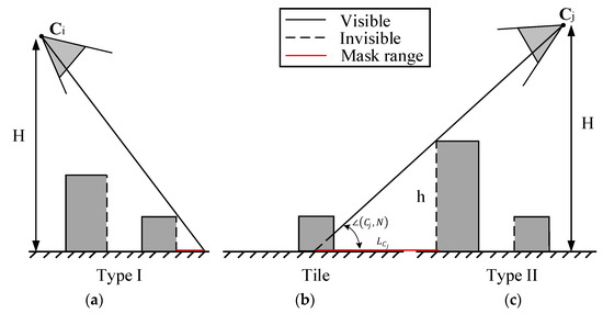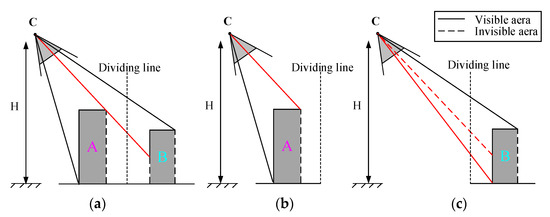 - Neighborhood block unit classification: First, the current texture reconstruction unit, as shown in Figure 6b, calculates the occlusion range according to the building outline and camera parameters extracted from the 3D mesh model , defined as Formula (1). Second, according to whether the occlusion influence range exceeds the spatial range of the neighborhood block, the neighborhood block units are divided into two categories. For Class I, the neighborhood is not occluded; that is, the triangular face of the neighborhood block unit cannot affect the occlusion relationship of the current reconstruction unit, as shown in Figure 6a. Conversely, Class II involves neighborhood occlusion; that is, the triangular face of the neighborhood block unit can affect the occlusion relationship of the current reconstruction unit, as shown in Figure 6c.where is the occlusion range under the current camera, is the height of the building model, and is the angle between the line connecting the current camera and the outer contour of the modeling model and the horizontal line on the ground.