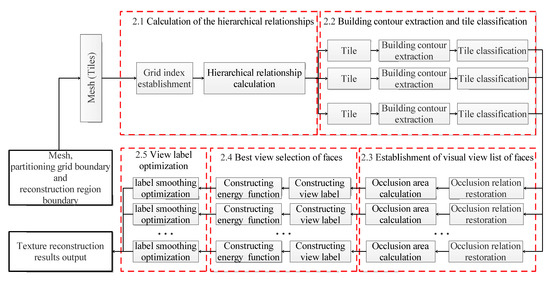 Common methods of texture reconstruction first build a visual list for each triangular face, and then select the best image for each triangular face based on the graph-cut method. These methods have problems such as high memory consumption, and difficulties in large-area texture reconstruction. Hence, this paper proposes a parallel method for texture reconstruction in large-scale 3D automatic modeling. First, the hierarchical relationships between the texture reconstruction are calculated in accordance with the adjacency relationships between partitioning cells. Second, building contours are extracted based on the 3D mesh model, the tiles are divided into two categories (occlusion and non-occlusion), and the incorrect occlusion relationship is restored based on the occluded tiles. Then, the graph-cut algorithm is constructed to select the best-view label. Finally, the jagged labels between adjacent labels are smoothed to alleviate the problem of texture seams. Oblique photography data from an area of 10 km2 in Dongying, Shandong were used for validation. The experimental results reveal the following: (i) concerning reconstruction efficiency, the Waechter method can perform texture reconstruction only in a small area, whereas with the proposed method, the size of the reconstruction area is not restricted. The memory consumption is improved by factors of approximately 2–13. (ii) Concerning reconstruction results, the Waechter method incorrectly reconstructs the textures of partially occluded regions at the tile edges, while the proposed method can reconstruct the textures correctly. (iii) Compared to the Waechter method, the proposed approach has a 30% lower reduction in the number of texture fragments.