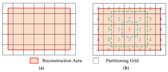 To ensure the correctness of the reconstructed block grid texture, it is first necessary to establish the hierarchical relationship of the block texture reconstruction. The specific provisions are as follows. (1) The innermost reconstruction area is the initial reconstruction unit, which can be determined based on the relative relationship between the block grid and the reconstruction area; that is, the initial reconstruction unit is the first layer. (2) The blocking units adjacent to the first layer are the second layer. The reconstruction order of the units at the same level is sorted according to the distance from the center of the blocking grid to the center of the reconstruction area. The smaller the distance is, the higher the priority of the reconstruction order. (3) By analogy, the nth layer is obtained “from the inside to the outside”, thereby establishing the hierarchical relationship of the texture reconstruction. According to the relative relationship between the original block grid and the reconstruction area, the innermost block unit of the reconstruction area is taken as the initial reconstruction unit. As shown in Figure 4, for the reconstruction range in Figure 4a, the corresponding texture reconstruction hierarchy is shown in Figure 4b.