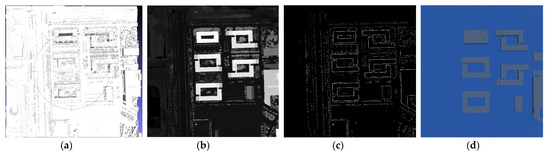 - Building outline extraction: The primary problem of the occlusion relationship recovery involves determining whether the neighborhood block unit grid affects the occlusion relationship of the current reconstructed unit grid, and the basis for the quick judgment of the occlusion relationship is to calculate the occlusion influence range by calculating the relative relationship between the building outline and the camera. Referring to the existing method [18], this paper also uses the digital surface model (DSM) for building contour-boundary recognition. Specifically, a DSM is first generated based on a 3D model (mesh), as shown in Figure 5b. Then, the Sobel edge-detection operator is used to extract the contour boundary of the model, as shown in Figure 5c. Then, the main direction of the building outline is detected on the two-measurement smooth line by RANSAC. Next, each edge of the contour is assigned a dominant direction based on the alignment target from the MRF formula, and the boundary edge is aligned to the target direction. Finally, a compact building model is generated based on the closed contour and the average height of the model, as shown in Figure 5d. For the detailed steps of the building contour model extraction process, which will not be repeated here, please refer to Zhu et al. [18].