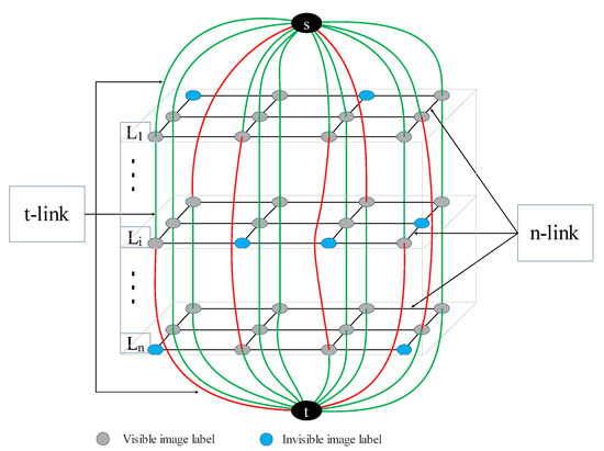The directed graph is an intuitive representation of the real world, consisting of a point set V with associated edges E between nodes; it can be expressed as . As shown in Figure 8, we constructed a directed weighted graph of the 3D mesh model of the scene, in which the two upper and lower special black terminal nodes are the source node and sink node of the directed graph G, respectively. The rest of the nodes are the nodes of each triangular face in the 3D mesh model in different labeled images, where the number of nodes in each layer is equal to the number of triangular faces. The nodes are connected by t-link and n-link edges, which indicate the adjacency of the triangular face. The t-link is the edge connecting the source node , the sink node , and the nodes of different labeled images; this is the data item of the energy function of the nodes for selecting different labeled images . If a labeled image is not in the visible image list of the triangular face, as shown by the blue node in Figure 8, the node has no t-link edge connected to it, as shown by the red line in Figure 8; if a labeled image is in the visible image list of the triangular face, as shown by the gray node in Figure 8, the node has t-link edge connected to it, as shown by the green line in Figure 8. The n-link is the edge connecting the nodes in the labeled image of the same layer, and it is the smooth term of the energy function of the adjacent nodes selecting the same labeled image.
