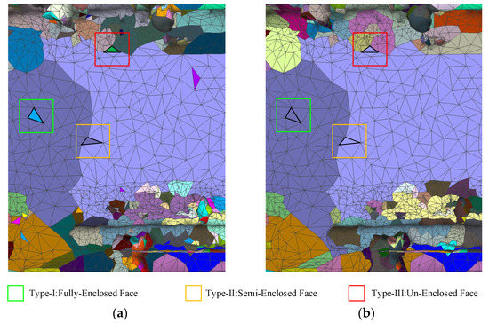 After the above processing steps, the optimal view labels have been selected for each triangular face; however, the generated view labels tend to produce jagged boundaries and increase the texture seam problem. To alleviate the boundary seam problem, the jagged boundary needs to be smoothed and optimized. In the method used in this paper, when the jagged triangular face is visible in the best view of the neighborhood triangular face, the jagged triangular face is sorted into one of three categories based on the best view labels of the first-order neighborhood triangular mesh of the sawtooth triangular mesh. Type (I) is a fully enclosed jagged triangular face, i.e., the first-order neighborhood mesh view labels are exactly the same with one kind of label, as shown in the green box in Figure 9a. Type (II) is a semi-enclosed jagged triangular face, i.e., the first-order neighborhood grid view labels are not exactly the same; there are two kinds of labels, as shown in the orange box in Figure 9a. Type (III) is an unenclosed jagged triangular face, that is, the first-order neighborhood grid view labels are not exactly the same, and there are three kinds of labels, as shown in the red box in Figure 9a. According to the type of jagged triangular face, different methods are used for smoothing, as follows: