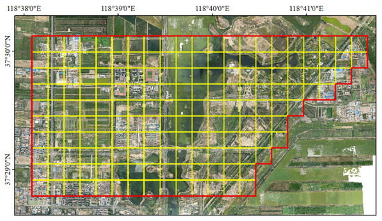 The method proposed in this paper was embedded into NewMap-IMS software, which is a reality modeling software that was independently developed by the authors at the Chinese Academy of Surveying and Mapping. A 4.0 km × 2.5 km built-up urban area in Shandong Province, China, was chosen as the experimental area. A 5-lens (1 vertical-view lens + 4 side-view lenses) UltraCam Osprey Prima (UCOp) camera was used in 29 flights to collect 11,795 images, totaling 2.08 TB of data. The corresponding reconstruction area is approximately 10 km2. The reconstruction area is divided into 173 subareas with a grid size of 250 m × 250 m, as shown in Figure 10. The operating environment is a standard personal computer equipped with the Windows 10 64-bit operating system, an Intel Xeon(R) E3-1535 M CPU with a dominant frequency of 3.10 GHz, and 64 GB of memory. The effectiveness and superiority of the proposed method are validated by comparatively analyzing the proposed method and the method proposed by Waechter et al. [8]. The experiments are composed of three parts: a comparative analysis of the texture reconstruction efficiency, a comparative analysis of the texture reconstruction results, and a comparative analysis of the number of texture charts.