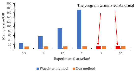 The memory consumption statistics of the two methods for texture reconstruction in experimental areas of varying sizes are shown in Table 2, and a corresponding bar graph is presented in Figure 12.