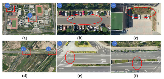 Texture charts obtained via the method proposed in this article. (a) texture charts for building area; (b,c) the texture charts of building area via the method proposed in this article; (d) texture charts for non-building area; (e,f) the texture charts of non-building area via the method proposed in this article. red frame is the local detail area; red circle is the experimental comparison area.