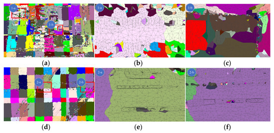 Texture charts obtained via the Waechter algorithm. (a) texture charts for building area; (b,c) the texture charts of building area via Waechter method; (d) texture charts for nonbuilding area; (e,f) the texture charts of nonbuilding area via Waechter method. red frame is the local detail area; red circle is the experimental comparison area.