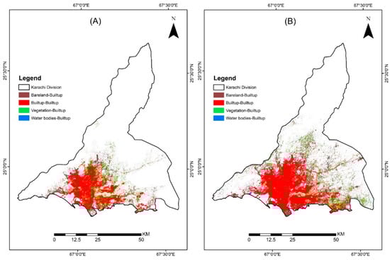 - Baqa, M.F.; Chen, F.; Lu, L.; Qureshi, S.; Tariq, A.; Wang, S.; Jing, L.; Hamza, S.; Li, Q. Monitoring and Modeling the Patterns and Trends of Urban Growth Using Urban Sprawl Matrix and CA-Markov Model: A Case Study of Karachi, Pakistan. Land 2021, 10, 700. [Google Scholar] [CrossRef]