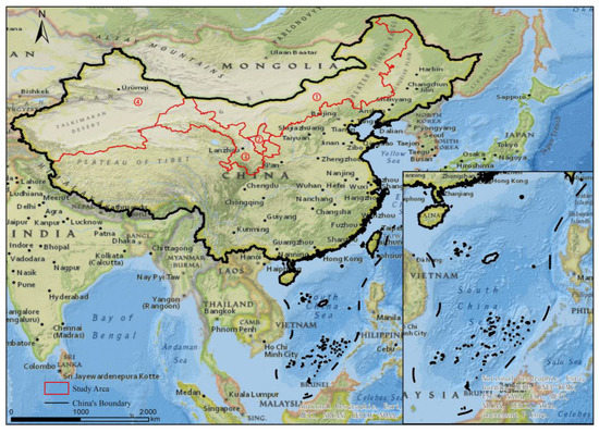 Study area: four provinces in northern China. 1—Inner Mongolia. 2—Ningxia. 3—Gansu. 4—Xinjiang. The four provinces include most of the grassland in northern China.