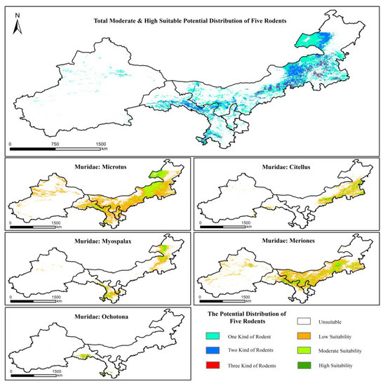 This study produced a map of the potential presence of rodents with high probability, and also identified the suitable environmental factors for the five major grassland rodent pests (Microtus, Citellus, Myospalax, Meriones, Ochotona) in northern China using the Maxent and remote sensing big data. Our study shows that Meriones and Microtus had the largest areas of High Suitability and Moderate Suitability with regard to environmental conditions within the study region. Myospalax and Citellus had the second largest areas of High Suitability and Moderate Suitability but this was a relatively agglomerate area. Ochotona had the smallest area of High Suitability and Moderate Suitability. The combination analysis of the areas of Moderate Suitability and High Suitability environmental conditions showed that for 66% of the total area, the conditions were suitable for just one rodent species, while conditions suitable for two and three kinds of rodents accounted for 31% and 3%, respectively. This suggests that 97% of the rodents’ potential distribution areas in the grassland of northern China have less than two rodent species present at the same time, due to the different environments. The altitude, land surface temperature in winter (November, December, February) and summer (May, June, July), vegetation covers in summer (July, August), precipitation from spring to summer (April, May, June) mainly determine the spatial distribution of grassland rodents and affect the spatial heterogeneity of rodents’ distribution. Our study confirms that meteorological factors are significant in assessing the suitability of the environment for grassland rodents, but other environmental factors (topography, vegetation and soil) also need to be taken into consideration.