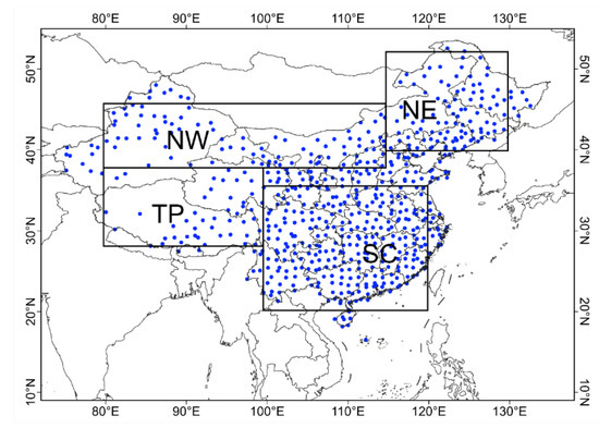 The spatial distribution of the 614 ground sites in China. The blue dots represent the location of each site. The acronyms in black represent the major regions of China. NW: northwestern region (38°N–46° N, 80°E–115° E); NE: northeastern region (40°N–52° N, 115°E–130° E); TP: Tibetan Plateau region (28°N–38° N, 80°E–100° E); SC: southern China (20°N–35° N, 100°E–120° E). The blue dots represent the location of each site.